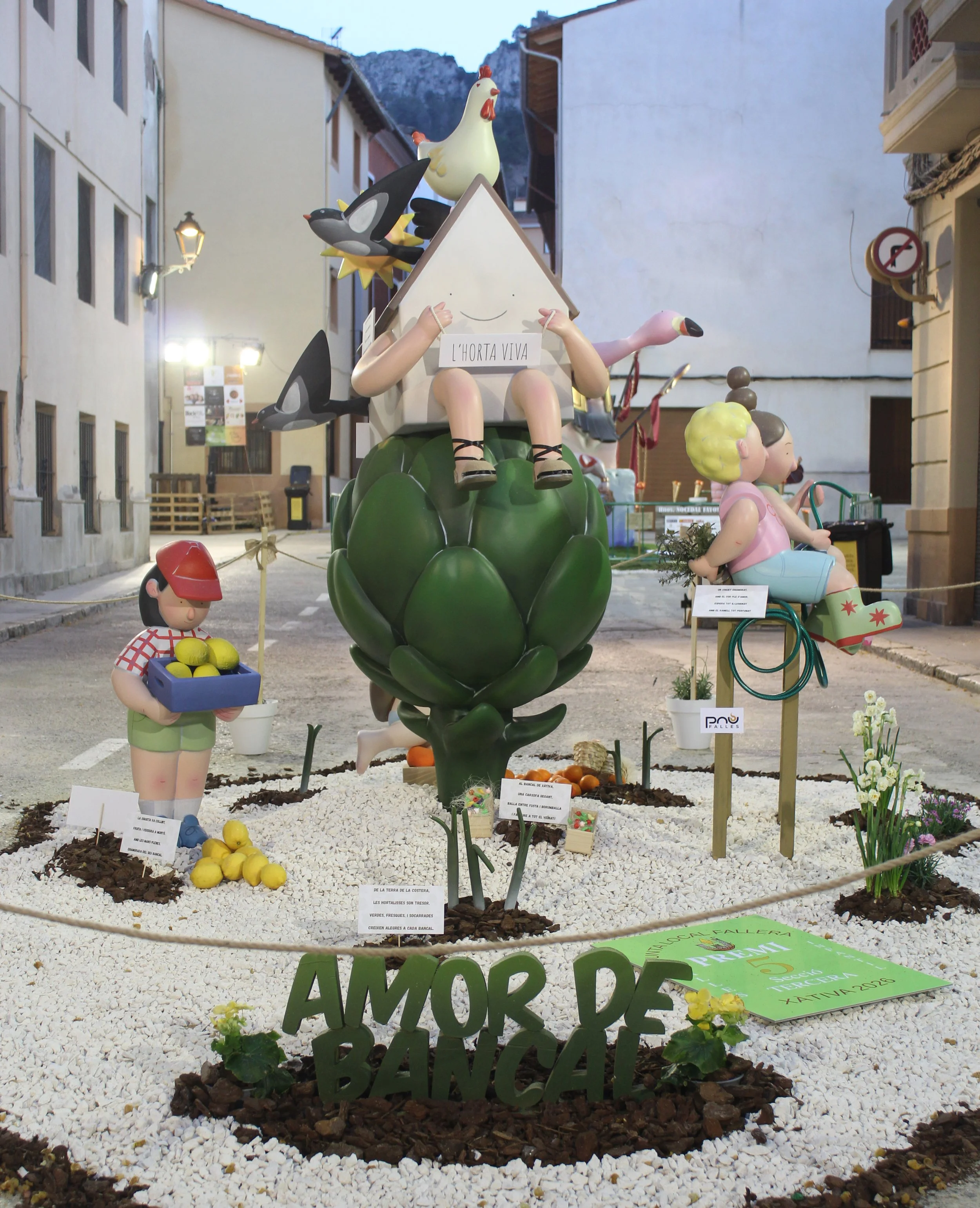L’eix central de la falla consta d’una barraca sobre una carxofa amb un conjunt d’animals que la sobrevolen. El ninot de l’exposició és un cupido que llança alls tendres perquè és de Xàtiva. I, finalment, als laterals trobem una parella d’enamorats (ell amb un ramell de romer, lavanda i olivera <3) i a l’altre una collidora de llimes.